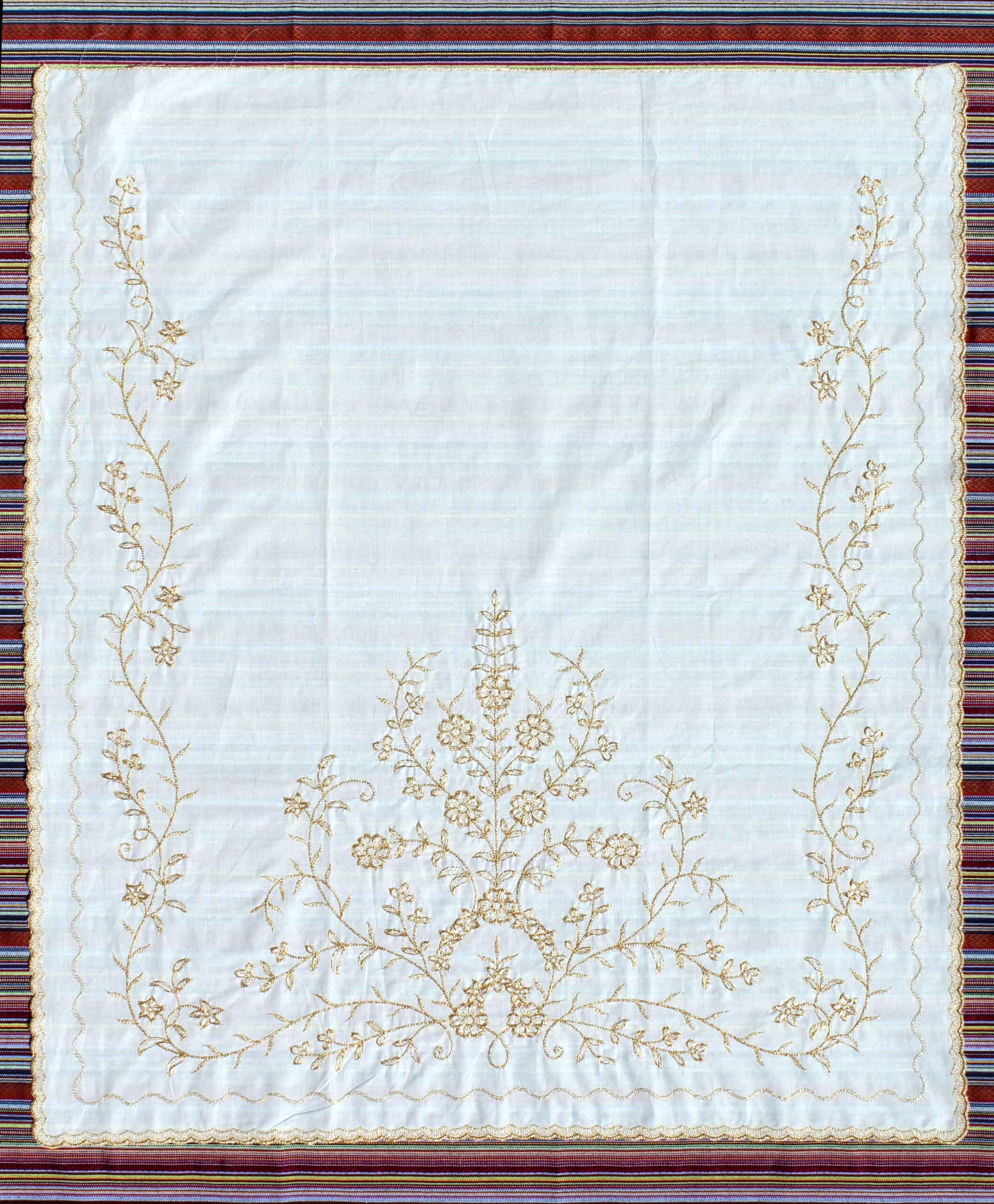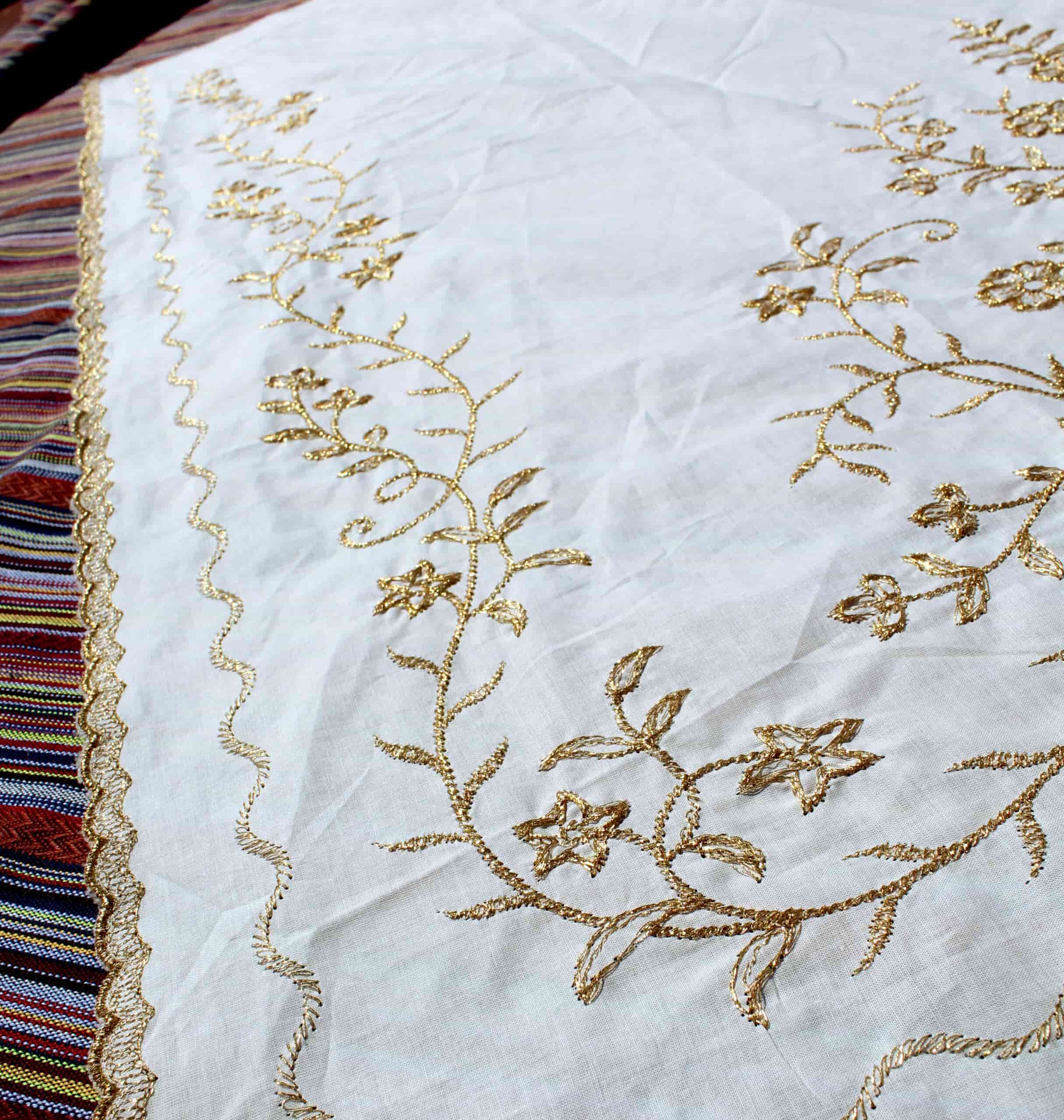 Delantal sencillo bordado con hilo dorado sobre batista de algodón, al estilo más tradicional, de talla 90.
