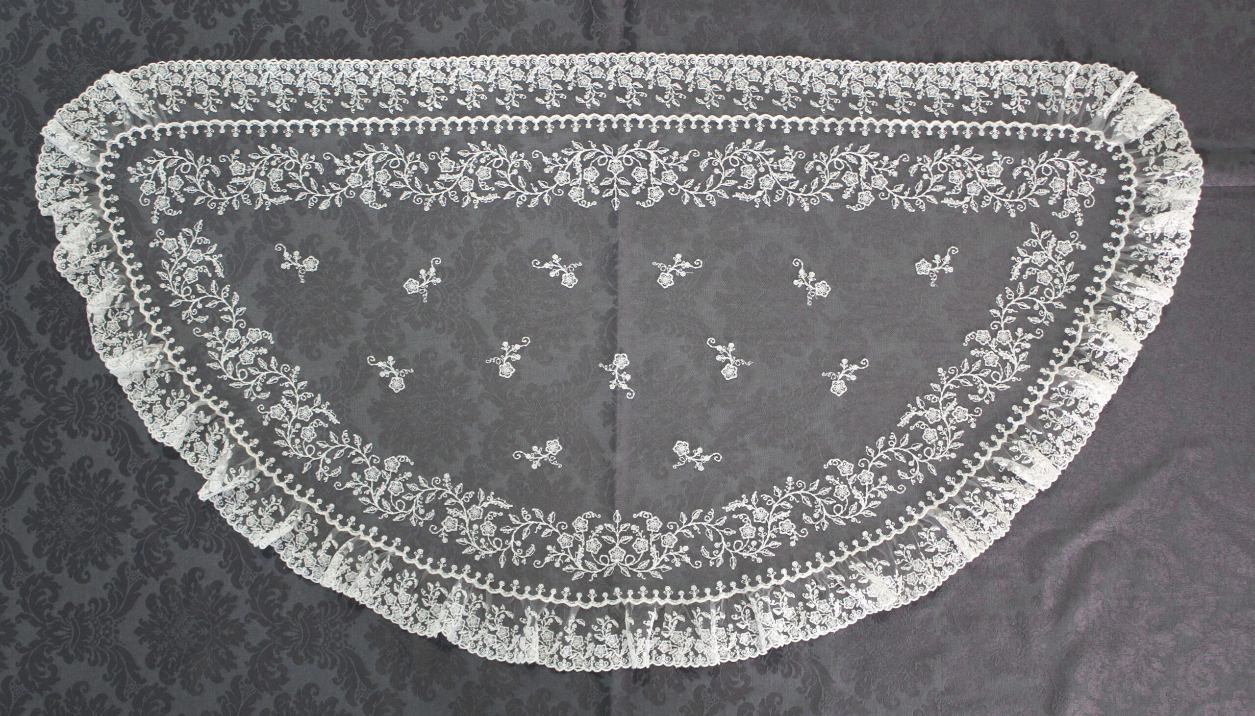 Mantilla de media luna pequeña, con un diseño limpio, sencillo y puntilla a juego.